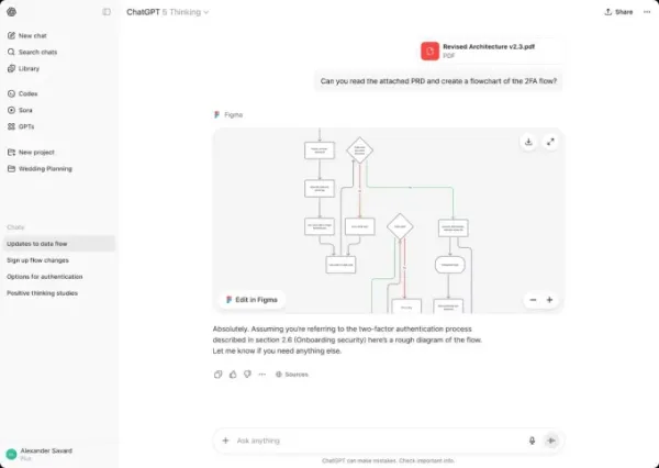 To use Figma in ChatGPTyou can ask it to generate diagrams, flow charts, and more. This is helpful for turning your ideas and brainstorming sessions into something more tangible. It may also be useful for visualizing complex concepts or workflows.